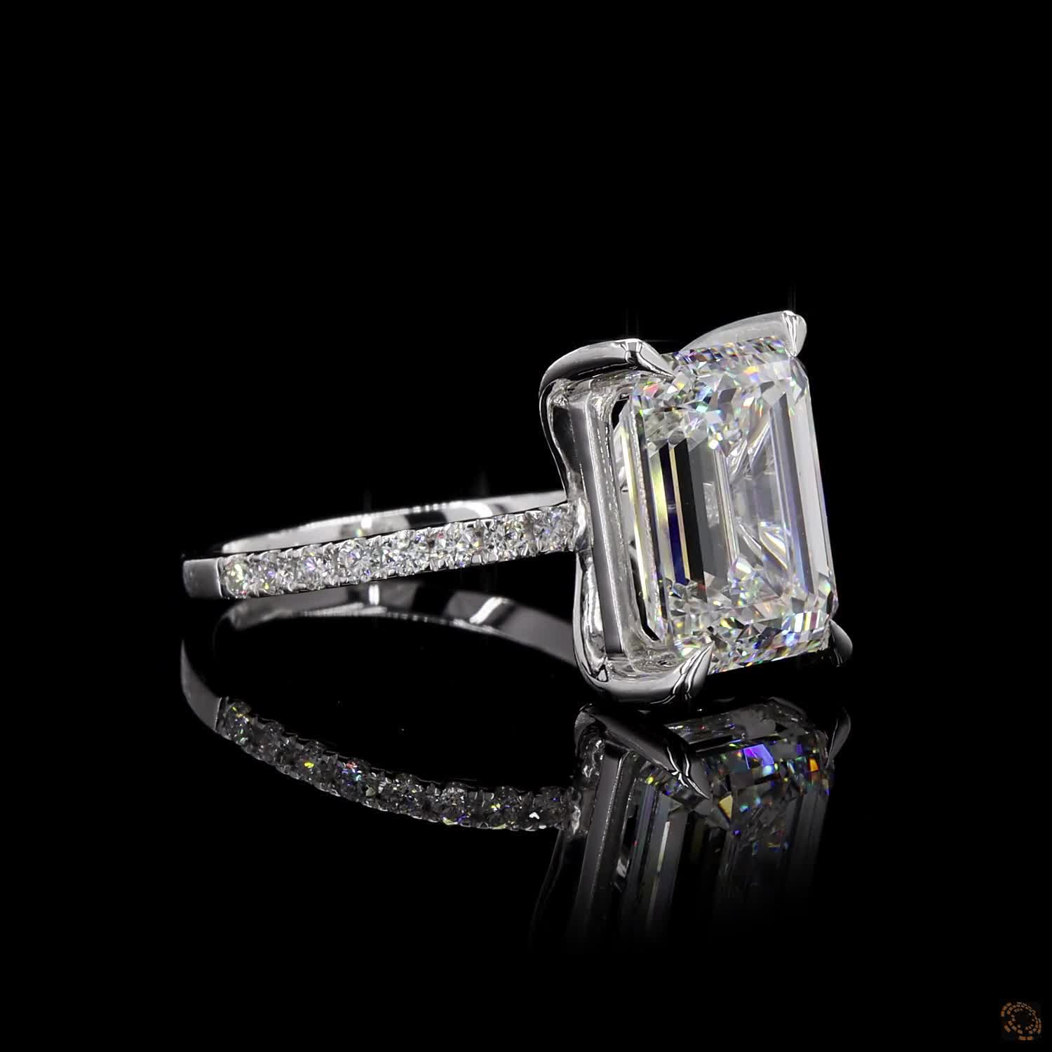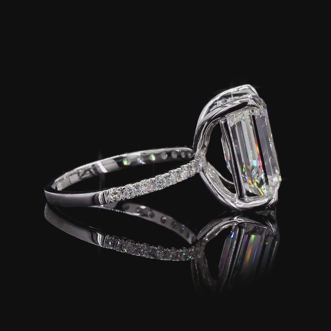 Levana is a bold statement of modern minimalism, led by an extraordinary emerald cut lab-grown diamond. With its elegant step-cut facets and mirror-like clarity, the center stone radiates a serene and powerful brilliance. Accentuated by a pavé band of 16 round lab-grown diamonds, this design balances bold geometry with feminine lightness.
