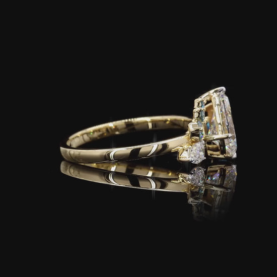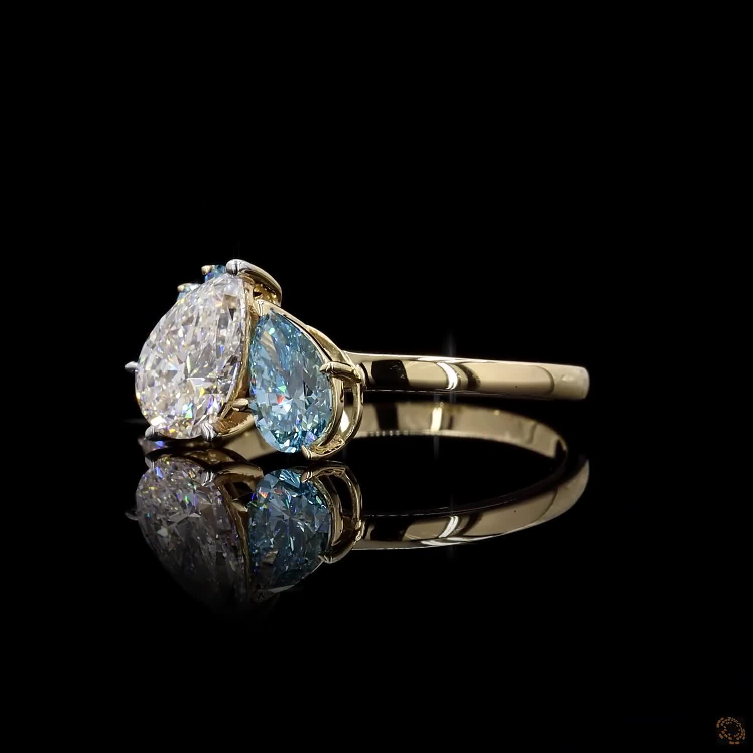 At the center, a 1.00 ct white pear-shaped diamond and a 0.50 ct lab-grown blue pear-shaped diamond face each other — symbolizing balance, connection, and the meeting of two worlds.