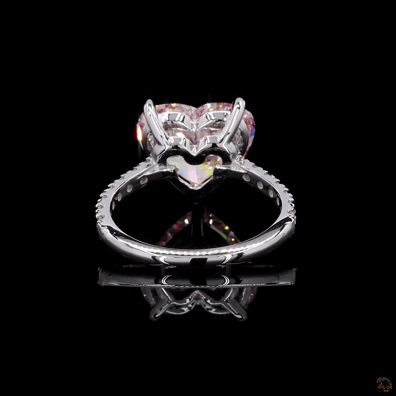 The centerpiece is a magnificent 5.37-carat heart diamond with an E-F color and VVS-VS clarity. The band is meticulously set with 14 round accent diamonds with a total carat weight of 0.31 and a DEF color and VVS-VS clarity. With a combined total carat weight of 5.67, this ring is a perfect blend of modern romance and timeless luxury, making it a truly unforgettable piece.