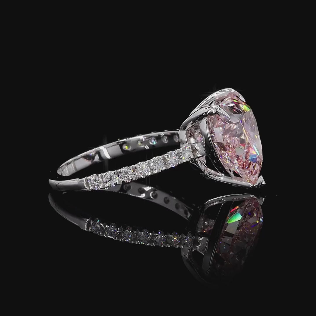 Declare your love with this breathtaking Affinity diamond ring. Crafted in warm rose gold, this ring features a magnificent lab-grown heart-shaped diamond in a rare and stunning fancy pink hue. The delicate band is beautifully accented with a row of round lab-grown diamonds, adding a radiant and classic touch.