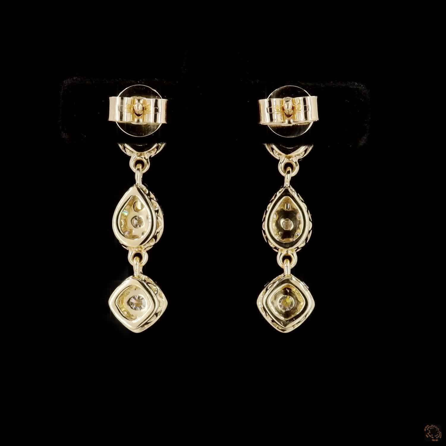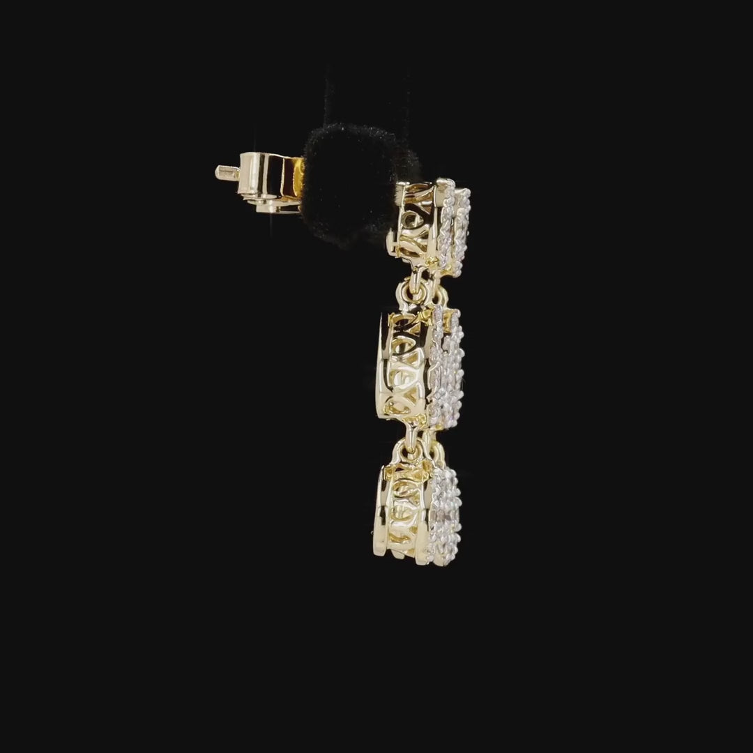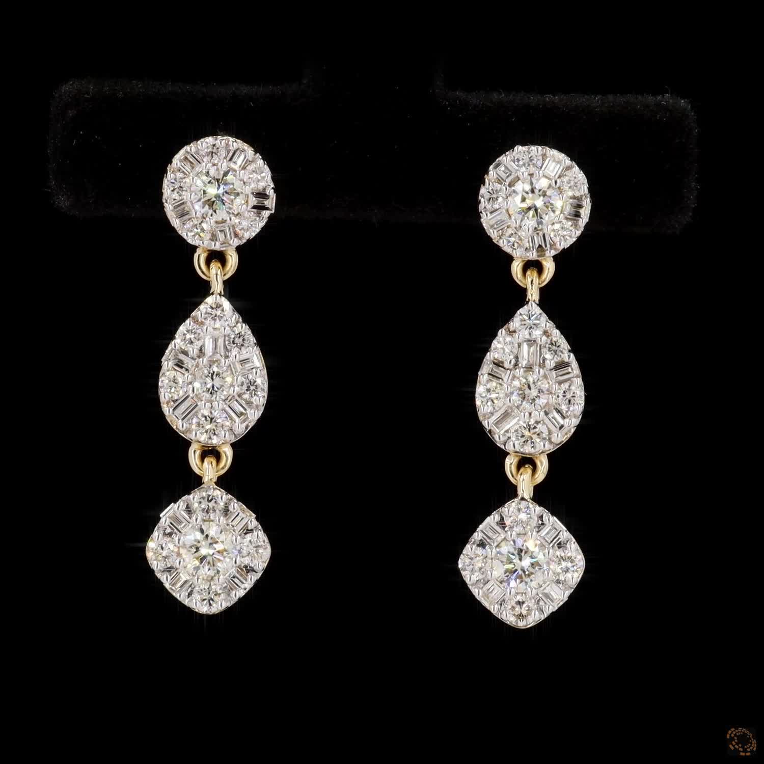 These stunning Celeste diamond drop earrings are a true testament to timeless style. Crafted in brilliant yellow gold, each earring features a captivating series of three distinct shapes—a round cluster, a pear-shaped cluster, and a rhombus cluster—all connected to create a beautiful and dynamic dangle design.