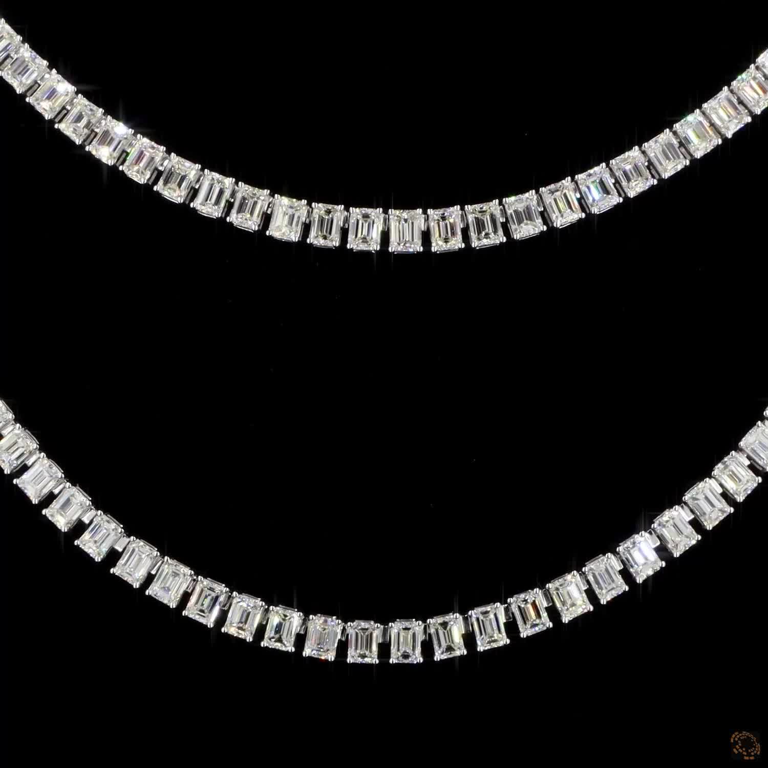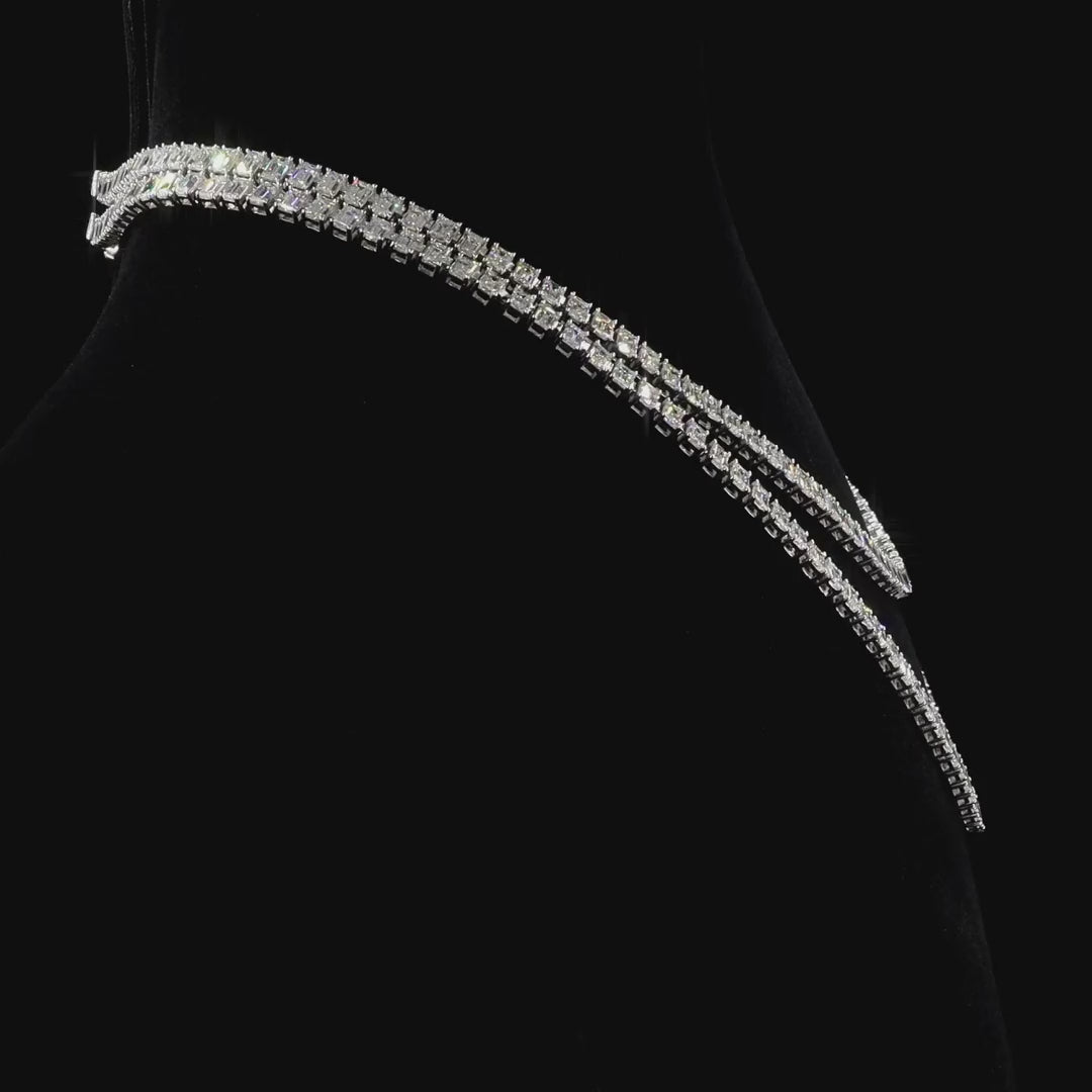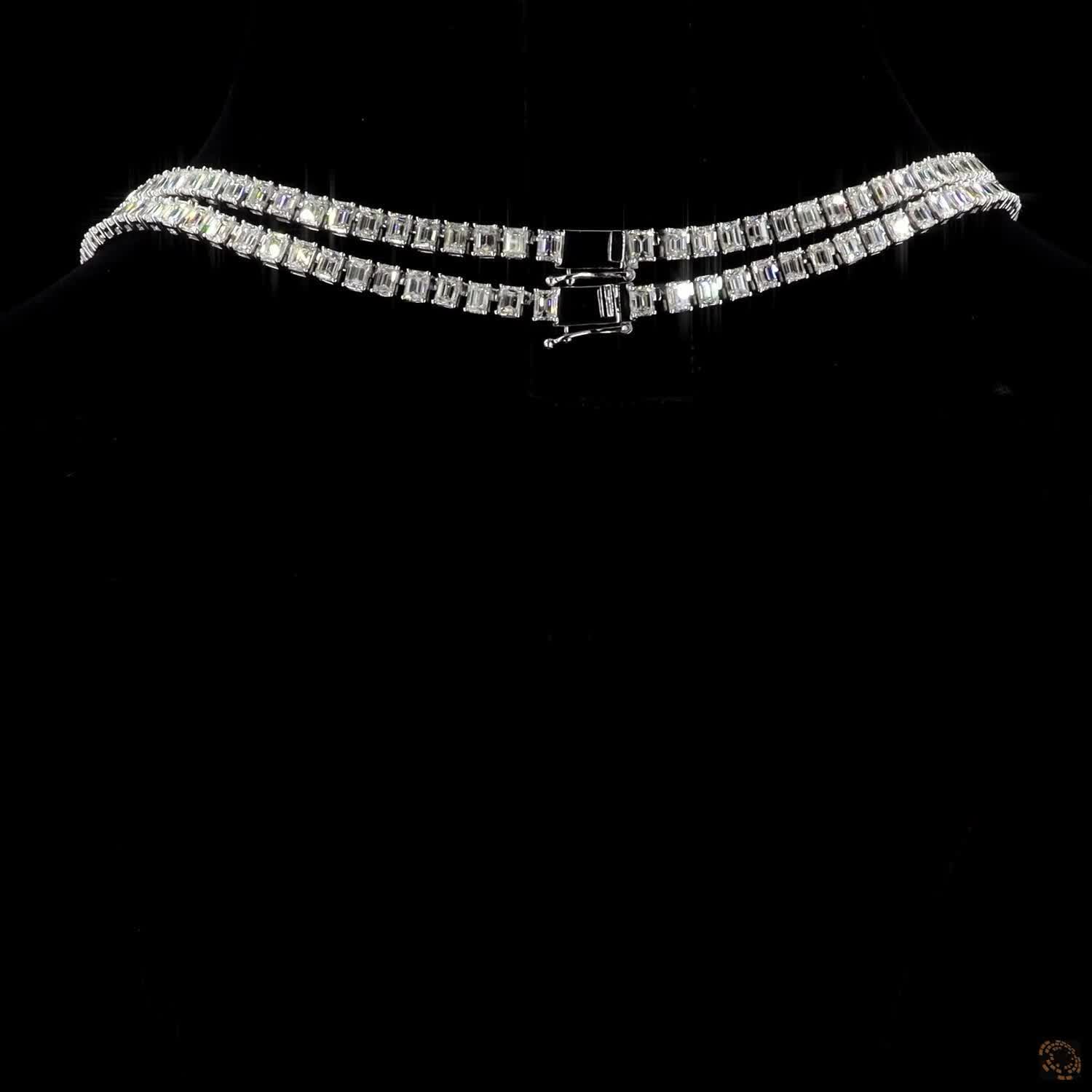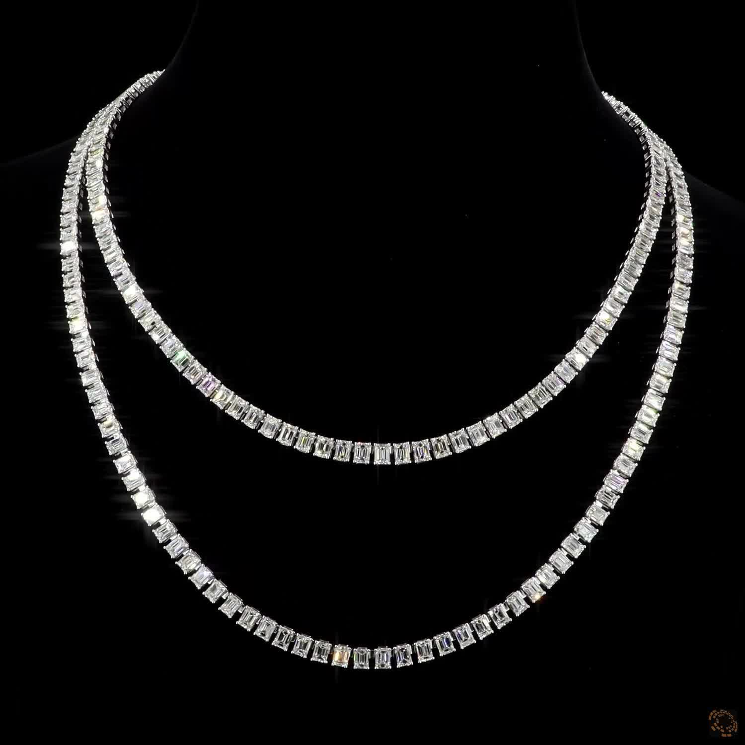 The Elara Necklace embodies refined luxury with its double-strand design, set in sleek white gold and adorned with meticulously matched emerald-cut lab-grown diamonds. Each diamond radiates brilliance and symmetry, creating a fluid line of light that enhances the necklace’s timeless sophistication.