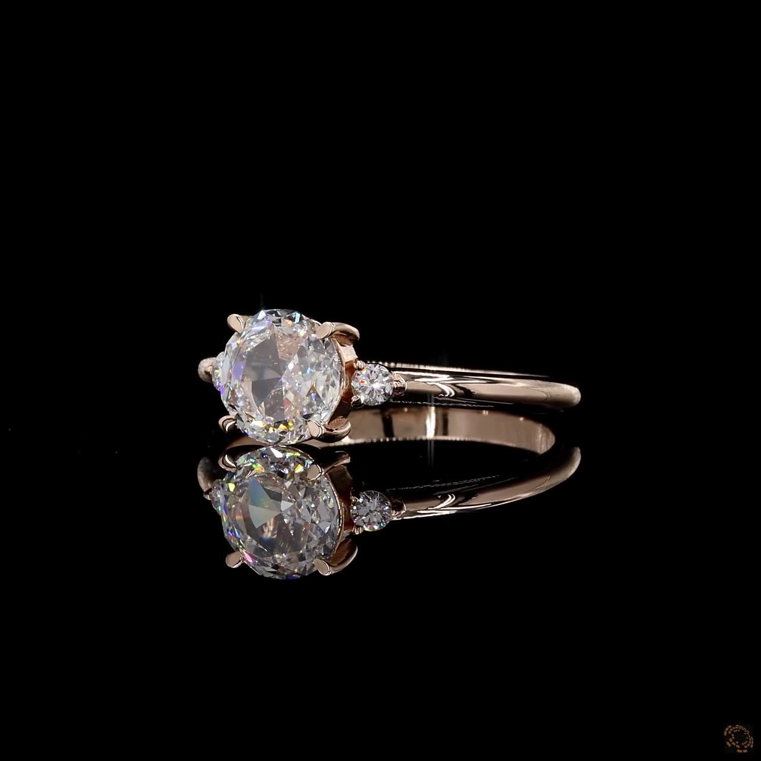 The central diamond weighs 1.02 carats with an E-F color and VVS-VS clarity. It's beautifully flanked by two smaller round lab-grown diamonds with a total carat weight of 0.06 and a DEF color and VVS-VS clarity. With a combined total carat weight of 1.08, this ring is the perfect blend of vintage charm and modern craftsmanship.