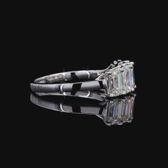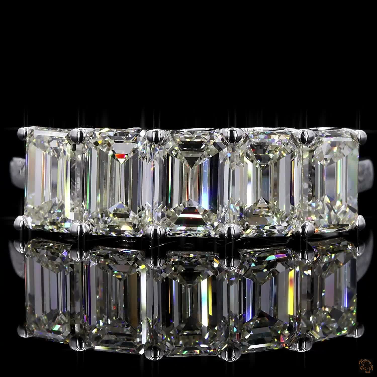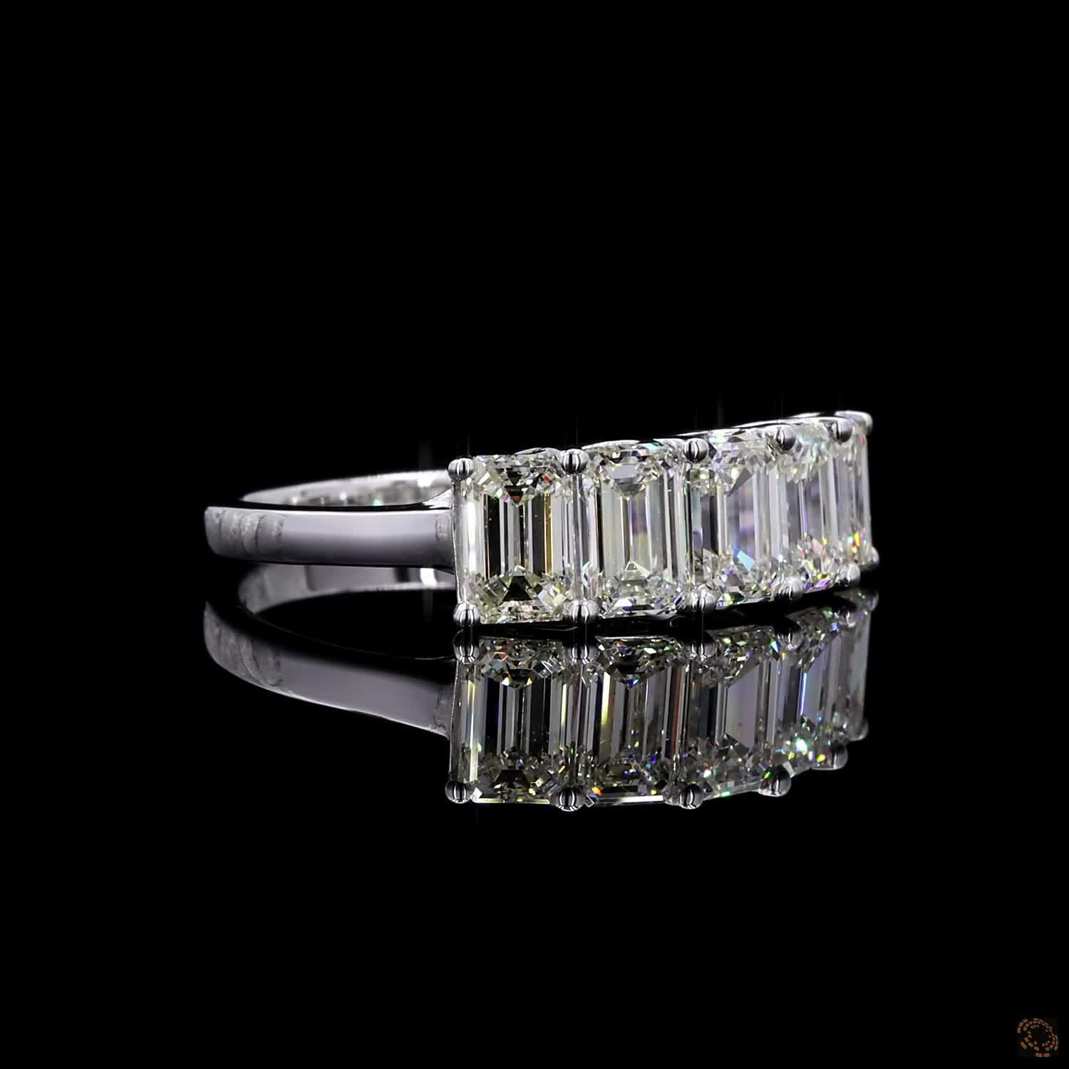 Make a brilliant statement with this magnificent Exquisite diamond ring. Crafted in stunning white gold, this ring features a sophisticated five-stone design, with five brilliant lab-grown emerald-cut diamonds set across the top. The elegant step-cut facets of the emerald shape create a mesmerizing "hall of mirrors" effect, showcasing the diamonds' exceptional clarity and brilliance.