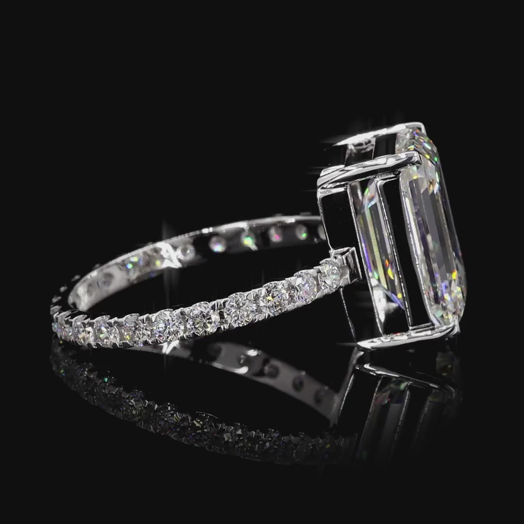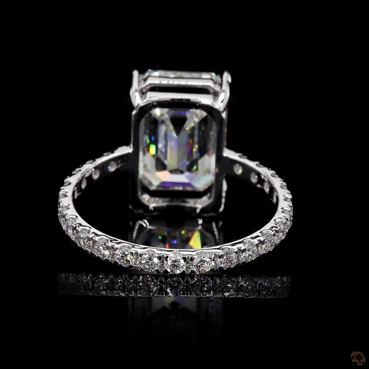 The main diamond weighs 4.61 carats with an E-F color and VVS-VS clarity. The band is beautifully accented with 23 lab-grown round diamonds with a total carat weight of 0.50 and a DEF color and VVS-VS clarity. With a combined total carat weight of 5.11, this ring is the perfect blend of modern luxury and timeless style, making it an ideal choice for an engagement ring or a cherished gift.