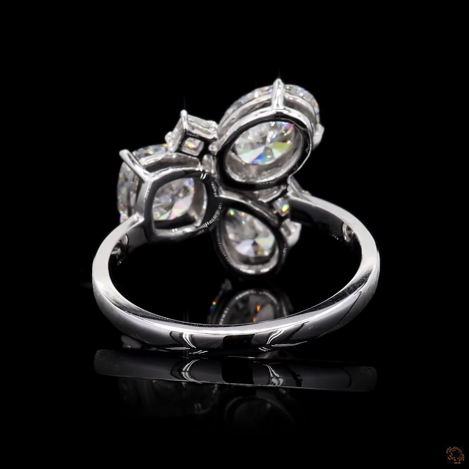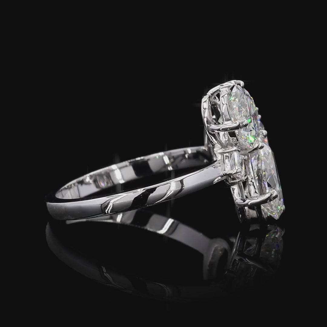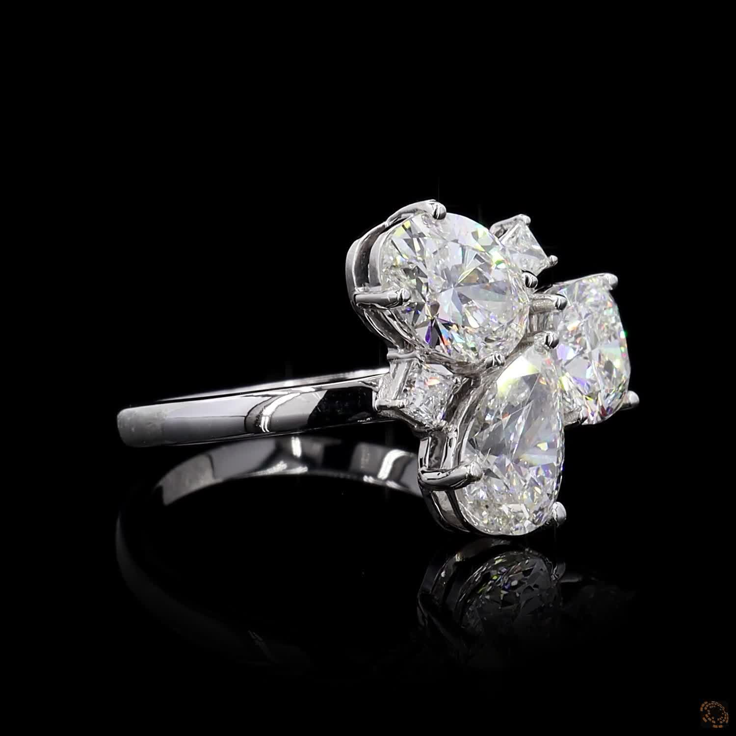 Make an unforgettable statement with this magnificent Exquisite diamond ring. Crafted in polished white gold, this ring features a stunning and unique three-stone design. The central cluster is made up of a brilliant cushion-cut diamond, a graceful pear-shaped diamond, and a timeless oval-cut diamond, all beautifully arranged to maximize their brilliance.