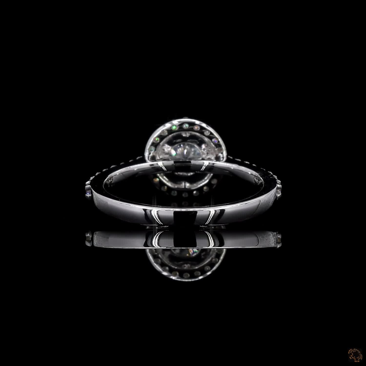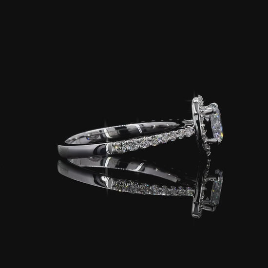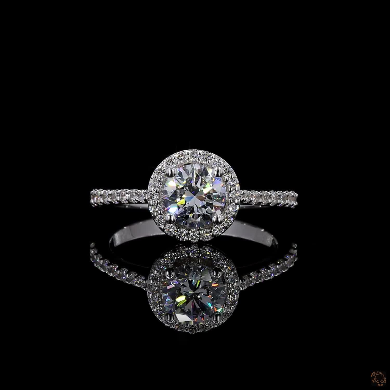The main diamond weighs 0.95 carats with an E-F color and VVS-VS clarity. The halo and band are beautifully accented with 36 lab-grown round diamonds with a total carat weight of 0.35 and a DEF color and VVS-VS clarity. With a combined total carat weight of 1.3, this ring is the perfect blend of classic romance and modern luxury, making it an ideal choice for an engagement ring or a cherished gift.