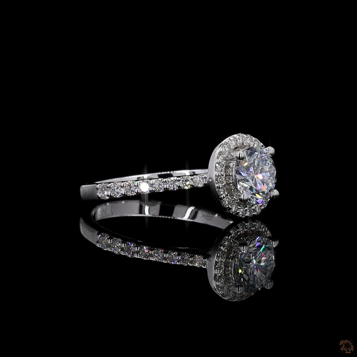 Make a brilliant statement with this magnificent Exquisite diamond ring. Crafted in stunning white gold, this ring features a dazzling lab-grown round diamond at its center, with an elegant halo of sparkling diamonds. The slender band is also beautifully encrusted with diamonds, creating a continuous display of light and brilliance.